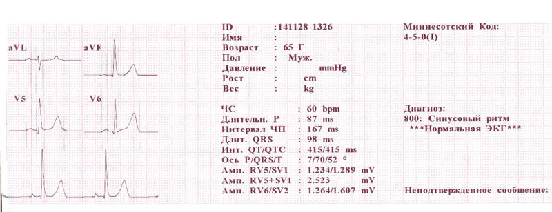 Окончательное заключение по МК содержит все выявленные на анализируемой ЭКГ признаки, но строго из числа указанных в его классификаторе. Полное ЭКГ-заключения по МК может выглядеть, например, так: 1-2-2p, 2-1, 4-1-2p, 5-2p, 4-4al, 8-3-1, 9-4-1. Это будет означать, что на ЭКГ в задних отведениях выявлен патологический зубец Q (0,03 с≤QII<0,04 c), горизонтальная или косонисходящая депрессия ST (1 мм≤JII(или III)<2 мм), отрицательный зубец Т амплитудой от 1 до 5 мм (во II или aVF, если в QRSaVF преобладают положительные зубцы); в передне-боковых отведениях – косовосходящая или U-образная депрессия (JI, или aVL, или V6) ≥1 мм, а также отклонение ЭОС влево, мерцательная аритмия и смещение переходной зоны в V3 или правее.